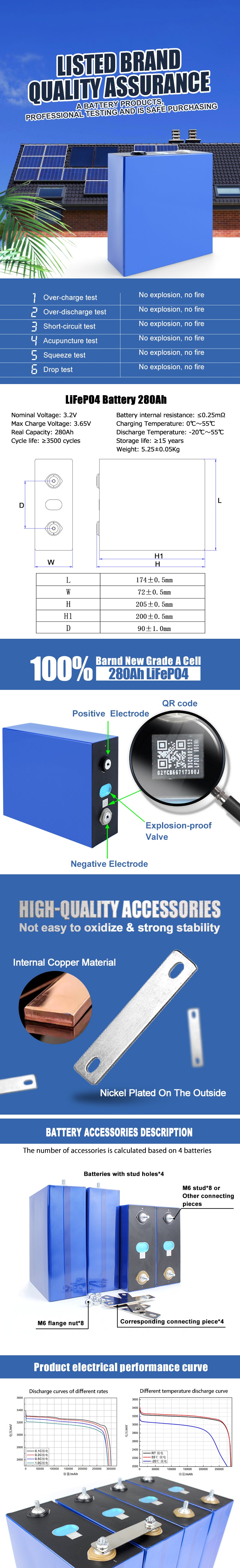 The Lifepo4 EVE 3.2V 280Ah battery are Grade A brand new cell with clear QR code. For easy assemble, we will weld M6 studs on the cell. Each battery will send 1 pcs copper busbar and 2 pcs nuts. The price to European United States countries are include custom clearance and tax.